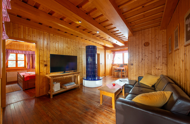 - spoločenská miestnosť s kuchynským a jedálnym kútom, elektrická keramická akumulačná pec