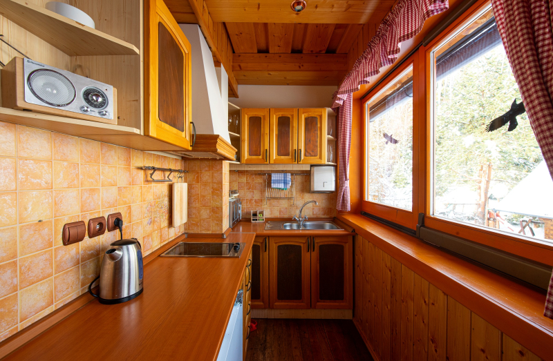 - spoločenská miestnosť s kuchynským a jedálnym kútom, elektrická keramická akumulačná pec